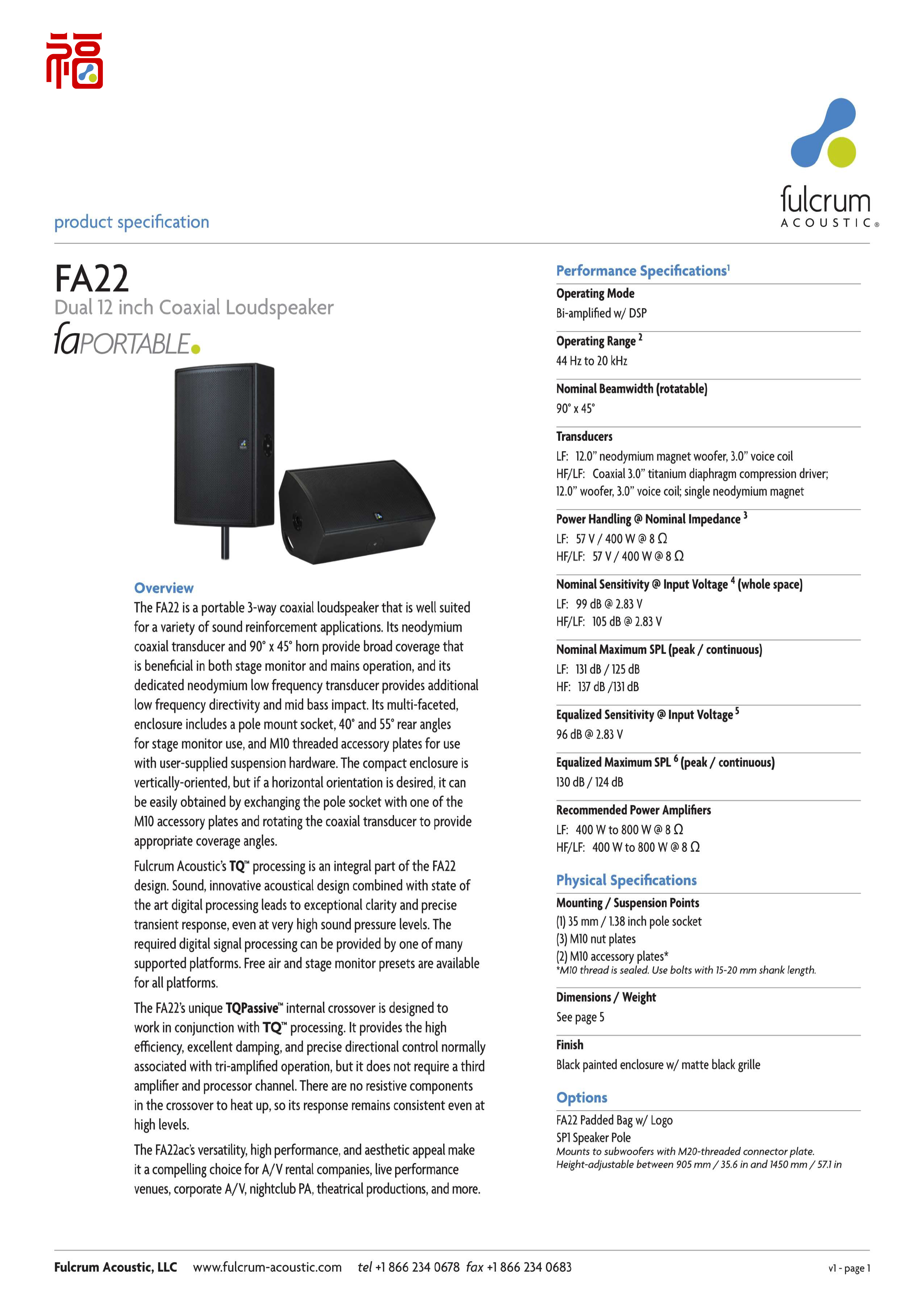 The FA22 is a portable 3-way coaxial loudspeaker that is well suitedfor a variety of sound reinforcement applications. ..