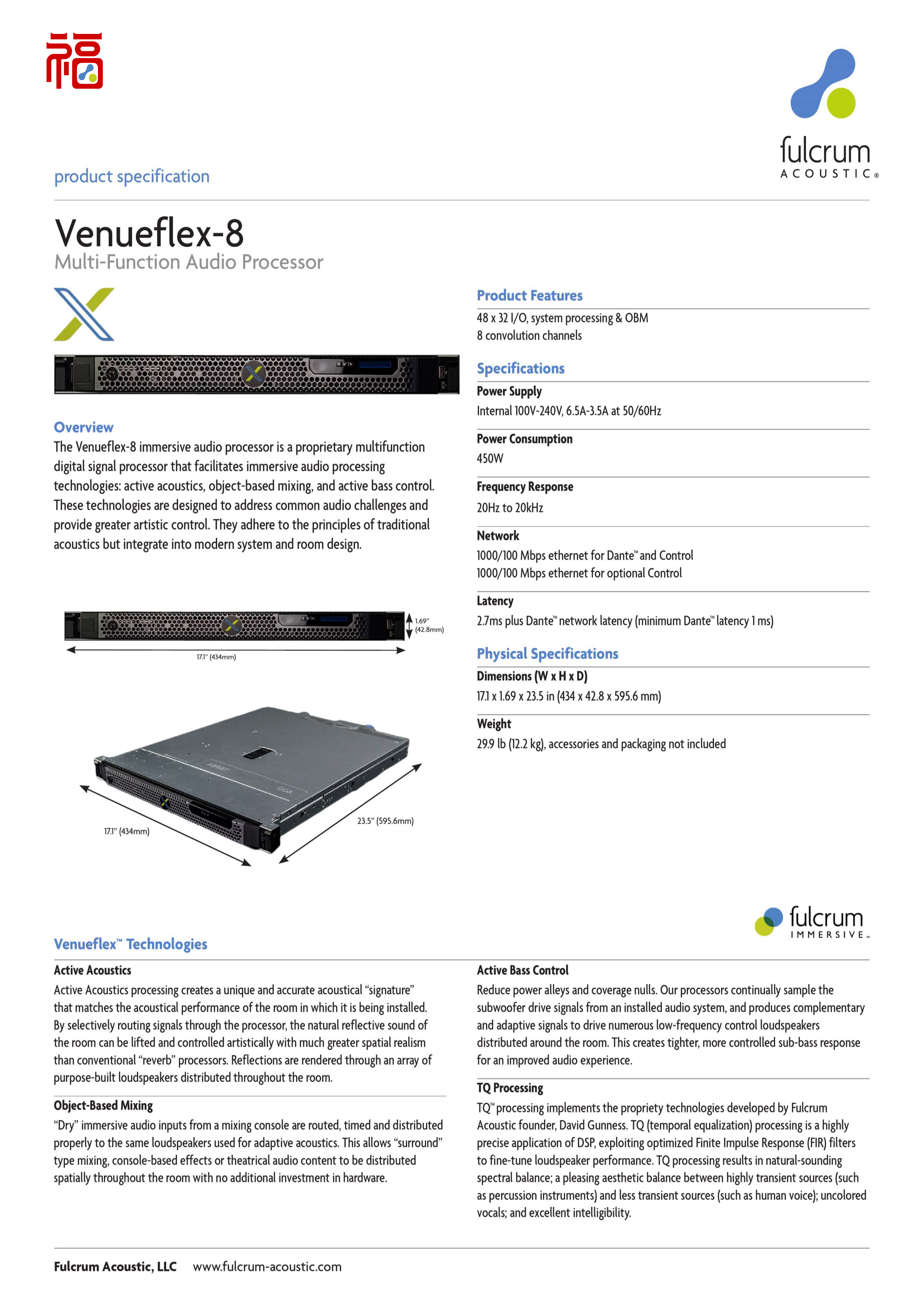 The Venueflex-8 immersive audio processor is a proprietary multifunctiondigital signal processor that facilitates immersive audio processingtechnologies: active acoustics, object-based mixing, and active bass control.These technologies are designed to address common audio challenges andprovide greater artistic control. They adhere to the principles of traditionalacoustics but integrate into modern system and room design...