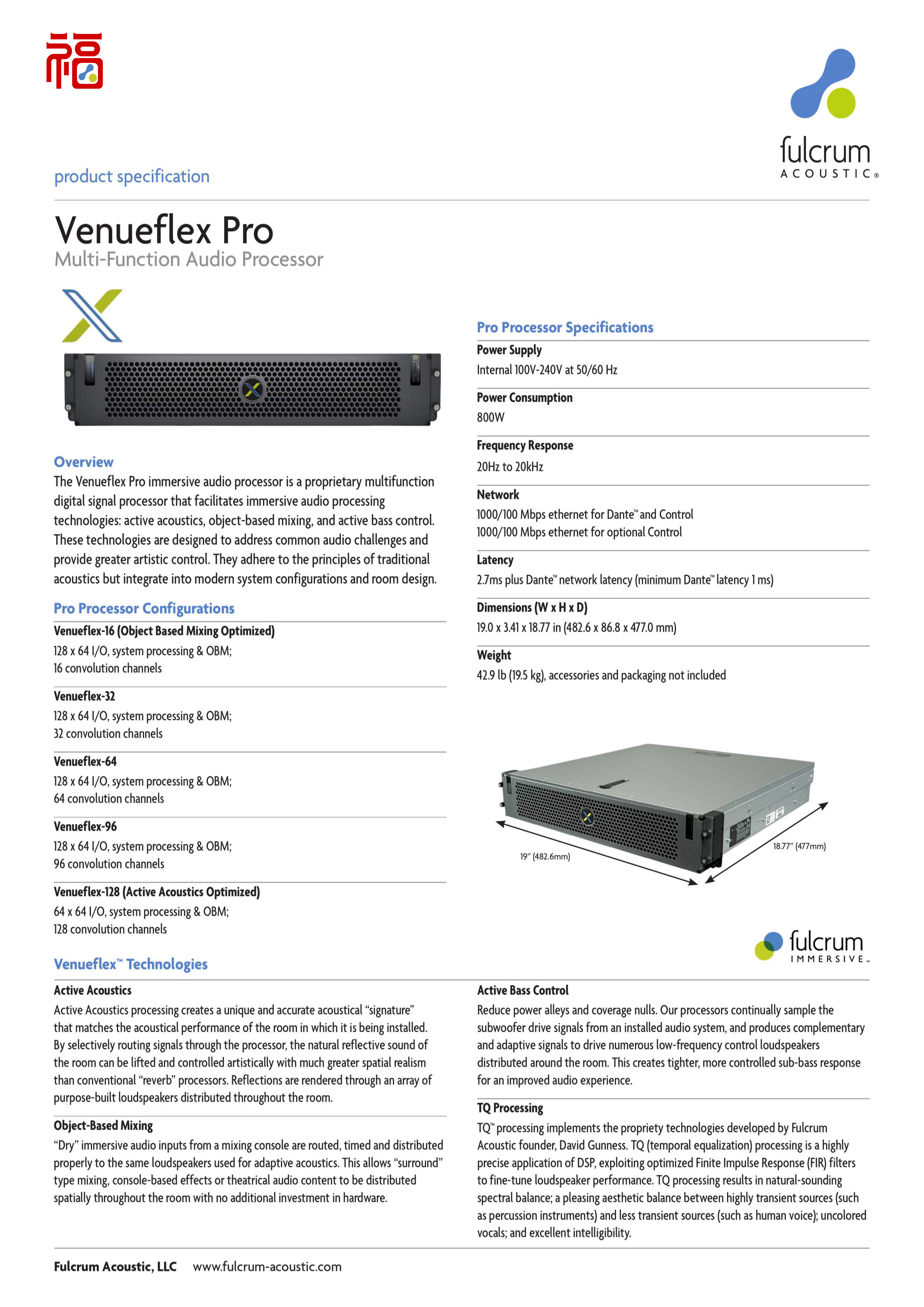 The Venueflex Pro immersive audio processor is a proprietary multifunctiondigital signal processor that facilitates immersive audio processingtechnologies: active acoustics, object-based mixing, and active bass control.These technologies are designed to address common audio challenges andprovide greater artistic control. They adhere to the principles of traditionalacoustics but integrate into modern system configurations and room design.