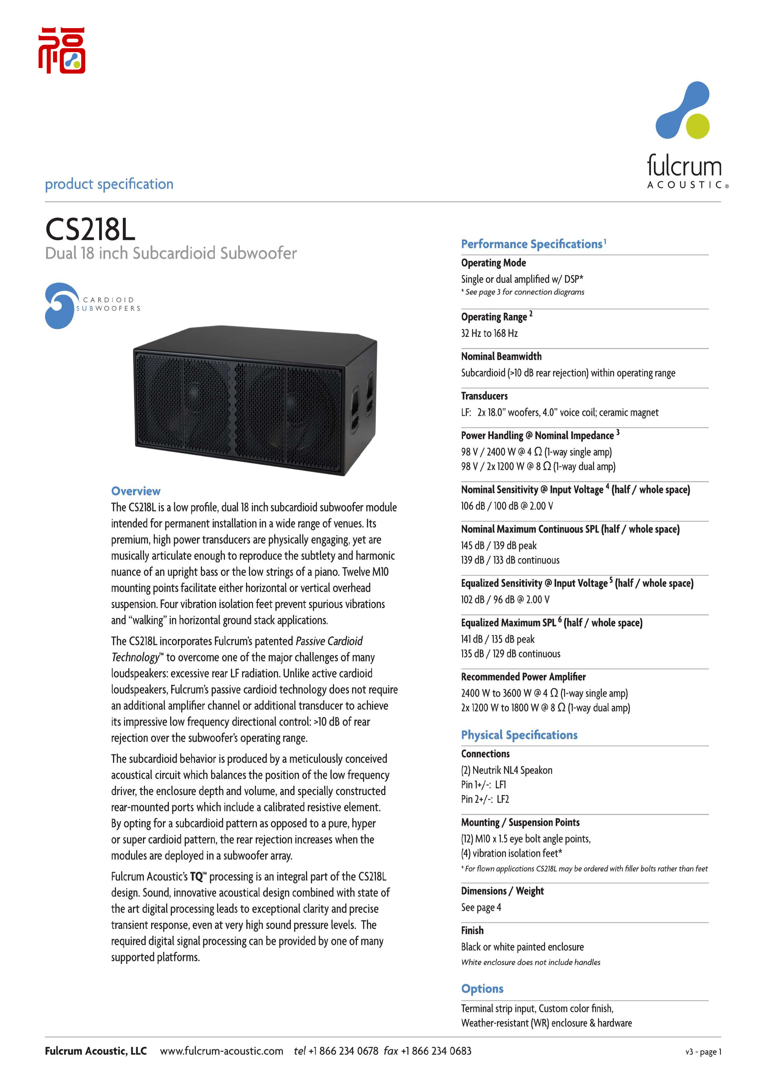 The CS218L is a low profile, dual 18 inch subcardioid subwoofer moduleintended for permanent installation in a wide range of venues...