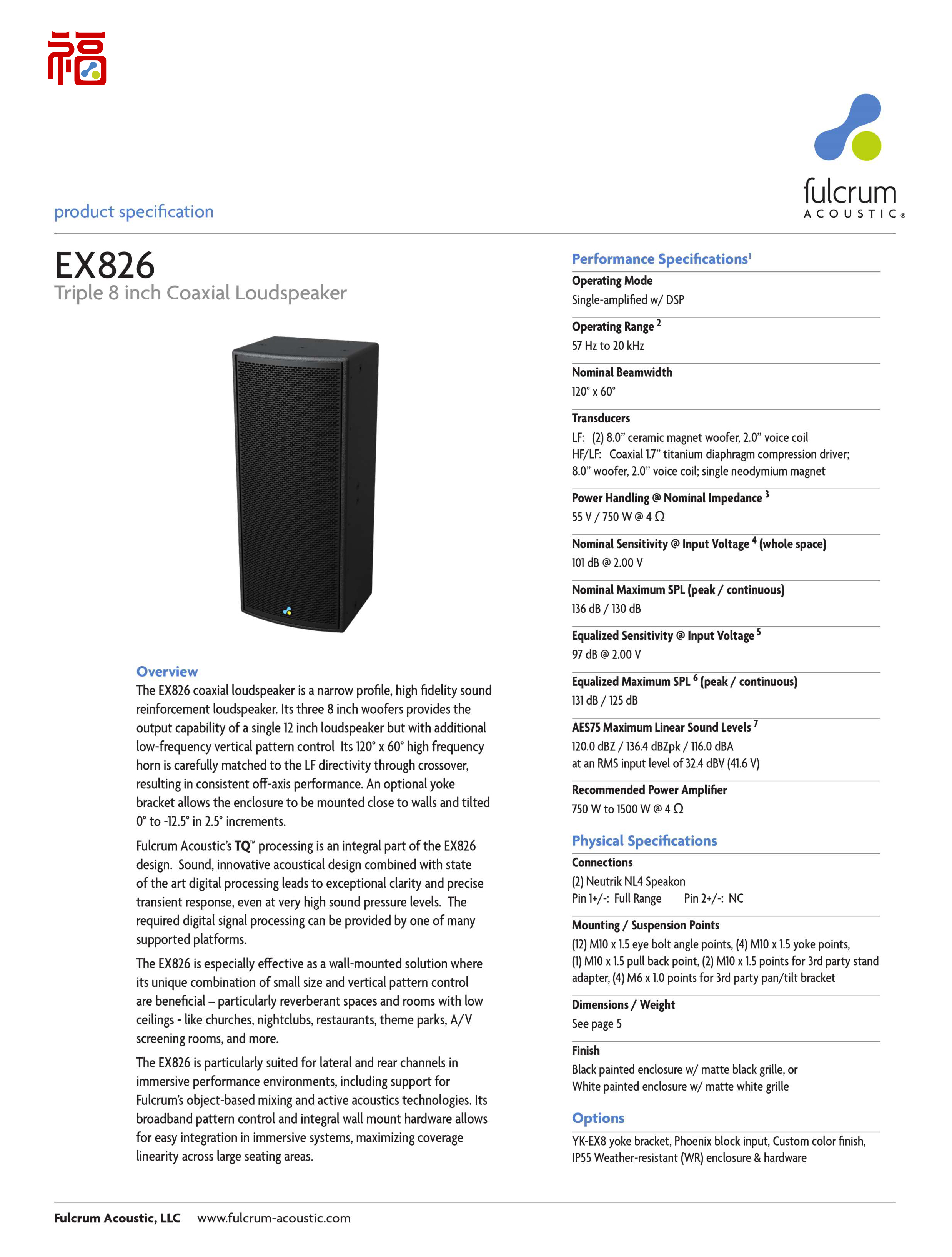 The EX826 coaxial loudspeaker is a narrow profile,high fdelity soundreinforcement loudspeaker.Its three 8 inch woofers provides theoutput capability of a single 12 inch loudspeaker but with additionallow-frequency vertical pattern control Its 120 x 60 high frequencyhorn is carefully matched to the LF directivity through crossover,resulting in consistent off-axis performance. An optional yokebracket allows the enclosure to be mounted close to walls and tilted0 to -12.5in 2.5 increments.